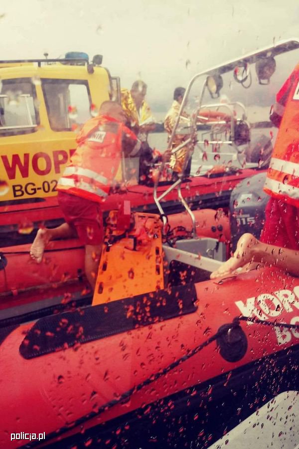 Około godz. 15:40 patrol "wodniaków" otrzymał zgłoszenie o wywróceniu się łodzi żaglowej i trzech osobach potrzebujących pomocy. Funkcjonariusze natychmiast popłynęli policyjną łodzią we wskazane miejsce. Trzej mężczyźni w wodzie nie mieli żadnych środków ratunkowych i byli wyziębieni. W tych warunkach pogodowych nie byli w stanie dopłynąć do brzegu. Ponadto ich żaglówka była całkowicie zatopiona.