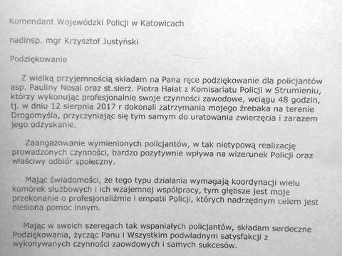 Na ręce Komendanta Wojewódzkiego Policji w Katowicach wpłynęły wyjątkowe podziękowania dla policjantów ze strumieńskiego komisariatu, którzy odnaleźli zabłąkanego źrebaka. Właściciele zwierzęcia podkreślili, że są wdzięczni za zaangażowanie, profesjonalizm i empatię mundurowych. To dzięki nim po dwóch dniach młody koń wrócił do opiekunów.