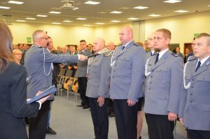 Po wystąpieniach okolicznościowych Pan Jarosław Zieliński – Sekretarz Stanu w MSWiA dokonał uroczystego wręczenia dyplomów uzyskania stopnia naukowego doktora, a następnie wręczył medale oraz odznaczenia funkcjonariuszom WSPol, .