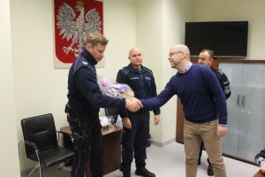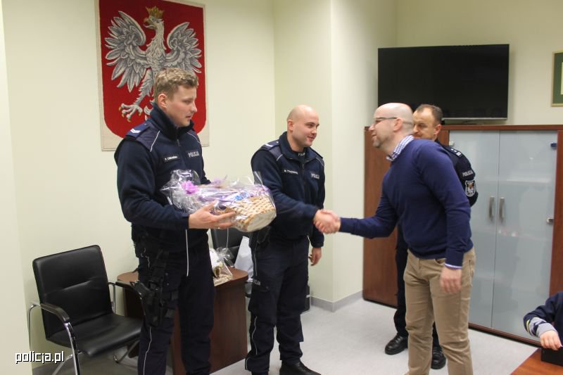St. sierż. Przemysław Chełmiński i st. sierż. Michał Tymochowicz z referatu prewencji na wodach i terenach przywodnych KMP w Szczecinie, którzy w ostatni piątek pilotowali auto do szpitala spotkali się z tatą nowo narodzonego chłopca, który specjalnie przyszedł do komendy podziękować im za udzieloną pomoc. Podkreślił, że na porodówkę dotarli dosłownie w ostatniej chwili, bo w kilka minut później na świecie pojawił się zdrowy maluszek.