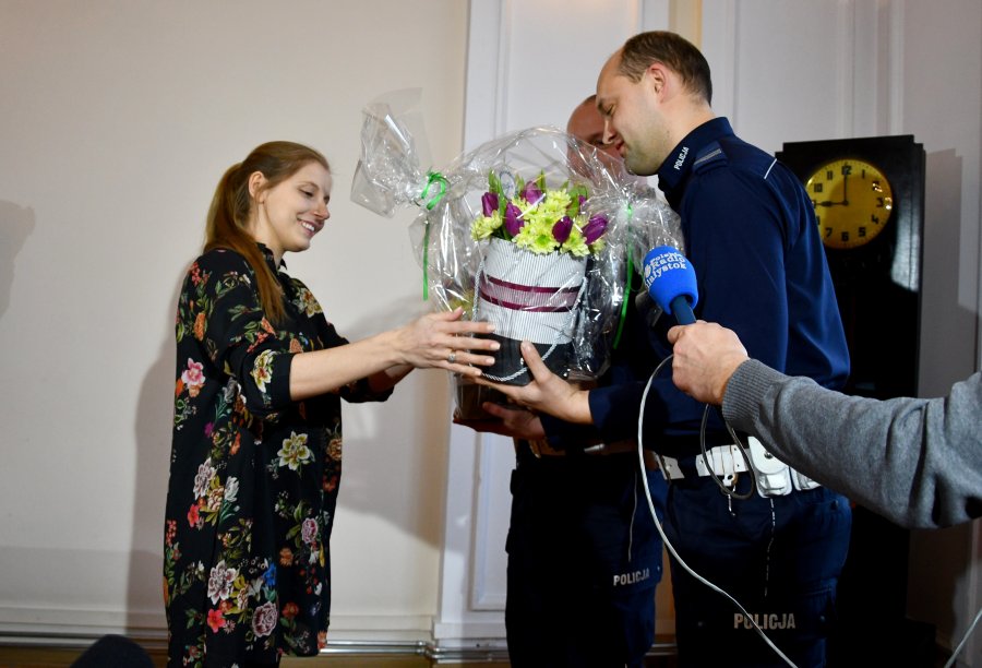 Dlaczego malutka Anastazja była dziś w komendzie? Co wspólnego ma dziewczynka z naszymi policjantami? Kiedy i w jakich okolicznościach się „poznali”? 8 styczeń, godzina 17.45, miejscowość Osowiec-Twierdza. Funkcjonariusze z Wydziału Ruchu Drogowego Komendy Wojewódzkiej Policji w Białymstoku, zauważyli pojazd osobowy marki Mercedes, którego kierowca wyprzedzał inne auto na zakręcie. Policjanci natychmiast zatrzymali go do kontroli drogowej. Ku ich zdziwieniu okazało się, że pasażerem mercedesa była kobieta w dziewiątym miesiącu ciąży, która uwaga - zaczęła już rodzić. Nasi „dzielni” policjanci natychmiast włączyli sygnały świetlne oraz dźwiękowe i rozpoczęli pilotaż auta do samego Białegostoku. Myśleliśmy, że nasza policyjna historia wówczas zakończy się. Tak było do wczoraj, kiedy ku naszemu zdziwieniu okazało się, że rodząca wówczas kobieta, wspólnie z mężem, a także swoją 10-dniową córeczką postanowili osobiście podziękować policjantom. Dziś wszyscy, w tym ważąca niespełna 3 kilogramy Anastazja, spotkali się w zupełnie innych okolicznościach, mniej dynamicznych i mniej stresujących. Było wiele ciepłych słów, spojrzeń i co najważniejsze cała ta niezwykła historia, jak widać, ma szczęśliwe zakończenie.