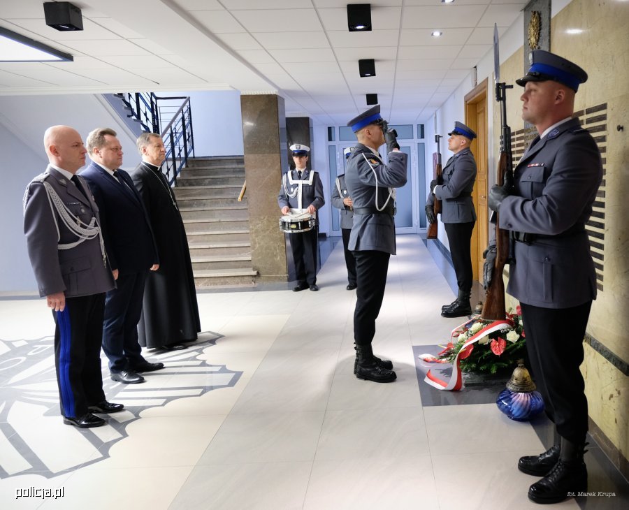 Ceremonia rozpoczęła się od zożenia wieńca i zapalenia zniczy przezd Tablicą upamiętniającą Poległych Policjantów. W ten sposób sekretarz stanu w MSWiA Jarosław Zieliński wraz z Biskupem polowym WP gen.dyw. ks. Józefem Guzdkiem i Komendantem Głównym Policji nadinsp. Jarosławem Szymczykiem złożyli hołd tym, którzy zginęli, chroniąc życie i zdrowie obywateli.