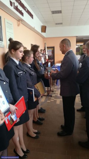 Po przywitaniu zebranych gości Dyrektor szkoły Pan Wiktor Zdunek, który wraz z przedstawicielami Policji wręczył certyfikaty ukończenia szkoły. Następnie I Zastępca Komendanta Powiatowego Policji w Lubaniu kom. Przemysław Rudzik przekazał nagrodę dla wyróżniającej się w nauce uczennicy klasy policyjnej Klaudii Sikorskiej życząc jej kolejnych sukcesów.