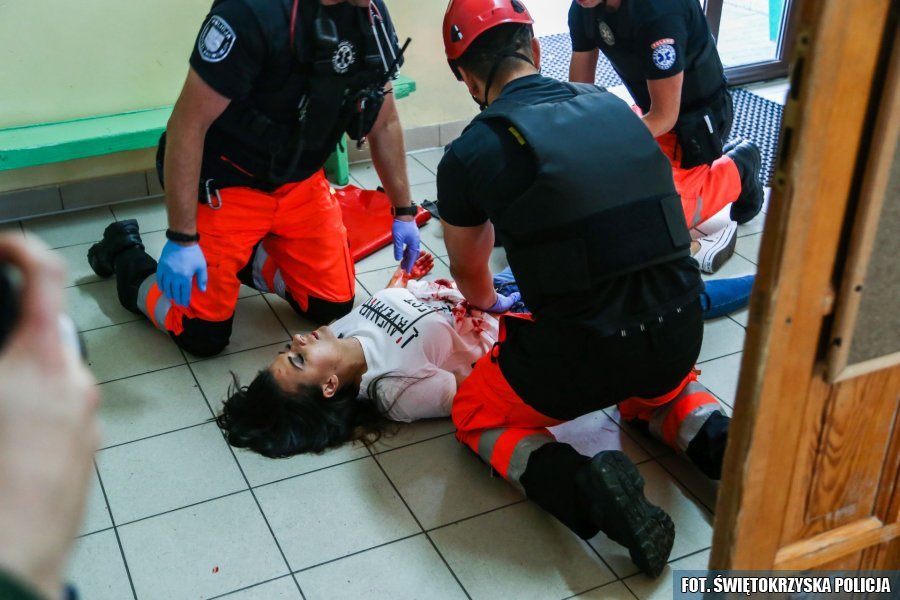 Na teren szkoły wtargnął uzbrojony napastnik, ranił jedną z pracownic i wziął za zakładnika nauczyciela. Taka sytuacja miała miejsce dziś na terenie Szkoły Podstawowej nr 24 w Kielcach, na szczęście to tylko ćwiczenia.