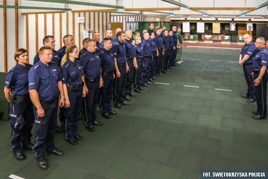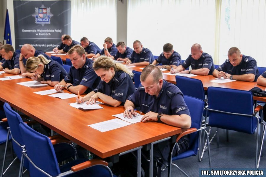 Dzisiejsze zmagania mundurowi rozpoczęli w Sali Narad im. mjr. Jana Piwnika, gdzie rozwiązywali test wiedzy. Do tej konkurencji oprócz 26 dzielnicowych przystąpiło również 12 Kierowników Rewirów Dzielnicowych, którzy reprezentowali Komendę Powiatową Policji w Busku – Zdroju, Jędrzejowie, Kazimierzy Wielkiej, Opatowie, Ostrowcu Świętokrzyskim, Skarżysku – Kamiennej, Starachowicach, Staszowie oraz Włoszczowie, a także Komedę Miejską Policji w Kielcach. Policjanci w ciągu godziny musieli odpowiedzieć na 60 pytań dotyczących przepisów Kodeksu Wykroczeń, Kodeksu Karnego, Kodeksu Prawa o Ruchu Drogowym, a także zagadnień z zakresu procedury niebieskiej karty, pracy dochodzeniowo śledczej oraz profilaktyki społecznej. Kierownicy musieli wykazać się również wiedzą z zakresu Zarządzenia nr 5 Komendanta Głównego Policji w sprawie metod i form wykonywania zadań przez dzielnicowego i kierownika dzielnicowych, a także wiadomościami odnośnie zarządzania zasobami ludzkimi.