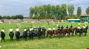 Policyjni jeźdźcy w czołówce na zawodach w Mezohegyes