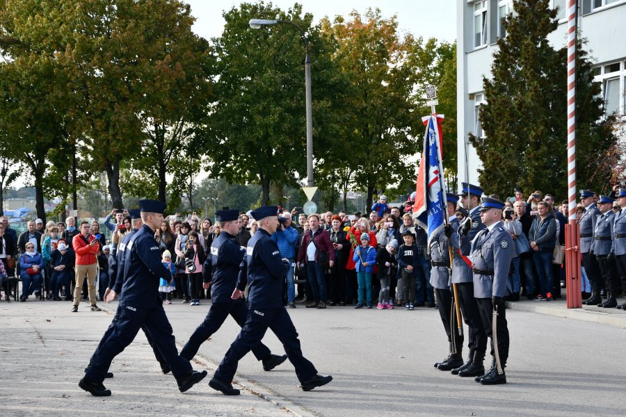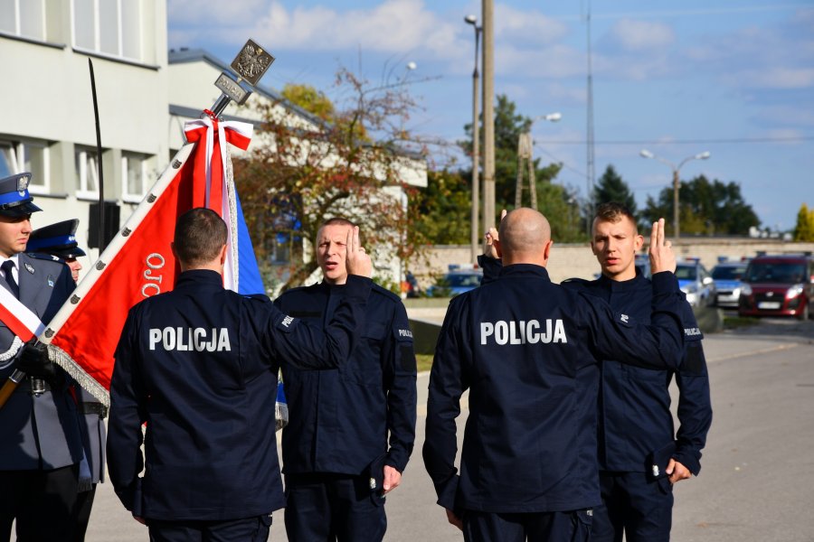 Dziś, na terenie Oddziału Prewencji Policji w Białymstoku odbyło się uroczyste ślubowanie 79 nowo przyjętych funkcjonariuszy, którzy będą pełnić służbę w podlaskim garnizonie Policji. Wypowiedzieli oni słowa roty ślubowania, po wcześniejszym sprostaniu wymogom stawianym kandydatom do służby i przejściu wszystkich etapów postępowania kwalifikacyjnego. Rotę ślubowania od nowych funkcjonariuszy przyjęli uczestniczący w uroczystości Sekretarz Stanu w Ministerstwie Spraw Wewnętrznych i Administracji Jarosław Zieliński i Komendant Wojewódzki Policji w Białymstoku nadinspektor Daniel Kołnierowicz. Policjanci ślubowali m.in. „Strzec bezpieczeństwa państwa i jego obywateli nawet z narażeniem życia…”. W uroczystości uczestniczyli również zaproszeni goście oraz rodziny i przyjaciele nowo przyjętych funkcjonariuszy. Zanim jednak młodzi adepci podlaskiej Policji będą mogli wesprzeć w codziennej służbie swoich starszych kolegów, czeka ich rozpoczynające się już 4 października, kilkumiesięczne szkolenie w jednej ze szkół policyjnych. Nowo przyjęci do służby mundurowi tradycyjnie mogli też dziś liczyć na gratulacje i uściski od przybyłych na uroczystość bliskich.