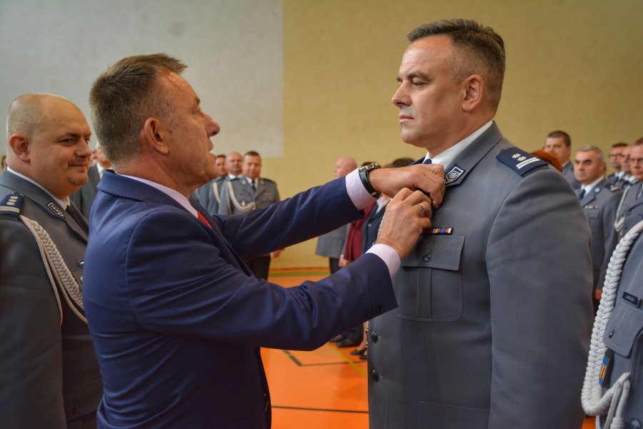 Kolejnym punktem uroczystości było wyróżnienie dwóch odchodzących na zasłużoną emeryturę oficerów Policji : podinsp. w stanie spoczynku Roberta Śniecikowskiego oraz podinsp. Pawła Rogulskiego..