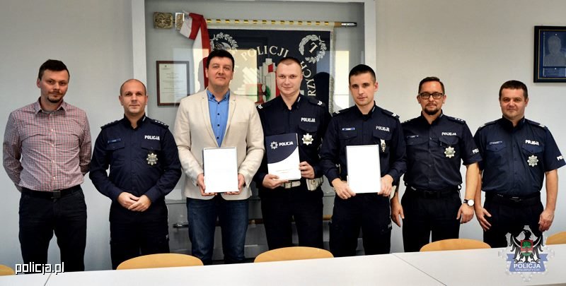 Z rąk Zastępcy Komendanta Miejskiego Policji w Wałbrzychu nadkom. Rafała Siczka mieszkaniec Jedliny-Zdroju Marcin Znamiec oraz dwaj policjanci Wydziału Ruchu Drogowego - st. sierż. Leszek Szubicki i st. sierż. Paweł Łabuda odebrali wczoraj listy gratulacyjne od Komendanta Miejskiego Policji w Wałbrzychu za uratowanie życia 74-letniego mężczyzny. Do podziękowań dołączył się także Mateusz Kaszubski, syn uratowanego wałbrzyszanina, który oświadczył, że jego ojciec dochodzi już do siebie, a obecnie przechodzi rehabilitację.