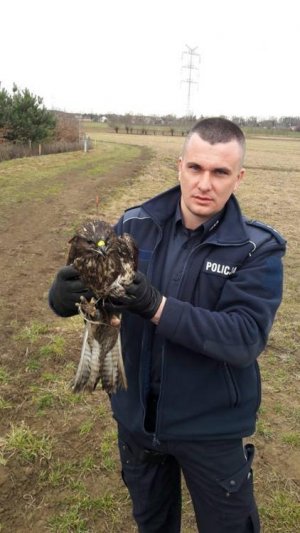Dzielnicowy, którego jedną z pasji jest fotografia przyrodnicza od razu poznał, że ma do czynienia z objętym ścisłą ochroną gatunkową myszołowem zwyczajnym. Pomimo zagojonych częściowo ran, z uwagi na poważnie uszkodzenie i brak szponów, ptak nie był w stanie samodzielnie poderwać się do lotu. Policjanci podejrzewali, że kilkanaście dni wcześniej padł czyjąś ofiarą lub miał inne niebezpieczne zdarzenie. Jednak mimo braku sił i traumatycznych przeżyć, okaleczony zwierzak dzielnie walczył o przetrwanie.