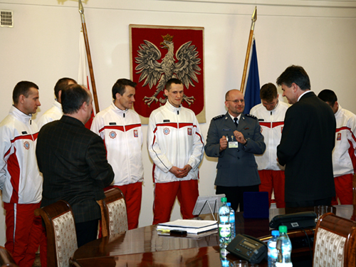 Następnie szef polskiej reprezentacji podziękował komendantowi za spotkanie i podkreślił, jak bardzo osiągnięcia sportowe policjantów wpływają na pozytywny wizerunek Policji.