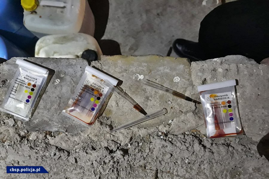 Likwidując laboratorium policjanci CBŚP zabezpieczyli 4 litry płynnej amfetaminy, a także kwasy, odczynniki chemiczne oraz naczynia i narzędzia służące do jej produkcji. Policjanci znaleźli także 4,5 kg amfetaminy, kilogram marihuany i 160 gramów kokainy. W mieszkaniu kobiety policjanci CBŚP znaleźli 117 gramów amfetaminy oraz sprzęt do porcjowania i przygotowywania narkotyków.