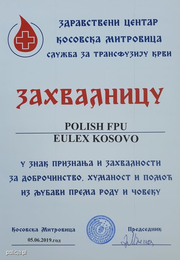 Polscy policjanci wchodzący w skład XXIX rotacji Jednostki Specjalnej Polskiej Policji w Kosowie 5 czerwca br. z inicjatywy kierownictwa Jednostki oddali krew na Oddziale Transfuzji Szpitala Miejskiego w Mitrowicy Północnej. Akcja została zorganizowana przez Czerwony Krzyż Štrpce. Obecny w trakcie akcji przedstawiciel Czerwonego Krzyża - pan Ivica Vanja Pužić przekazał podziękowania dla wszystkich honorowych krwiodawców z Polski. W całej akcji wzięło udział 20 funkcjonariuszy polskiej Jednostki, oddając łącznie około 9 litrów krwi. O wielkim darze polskich policjantów informowały szeroko lokalne media.
