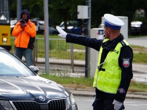 Opis filmu: Policjanci kierują ruchem drogowym na skrzyżowaniu. Słychać odgłosy ruchu ulicznego i gwizdki policyjne.