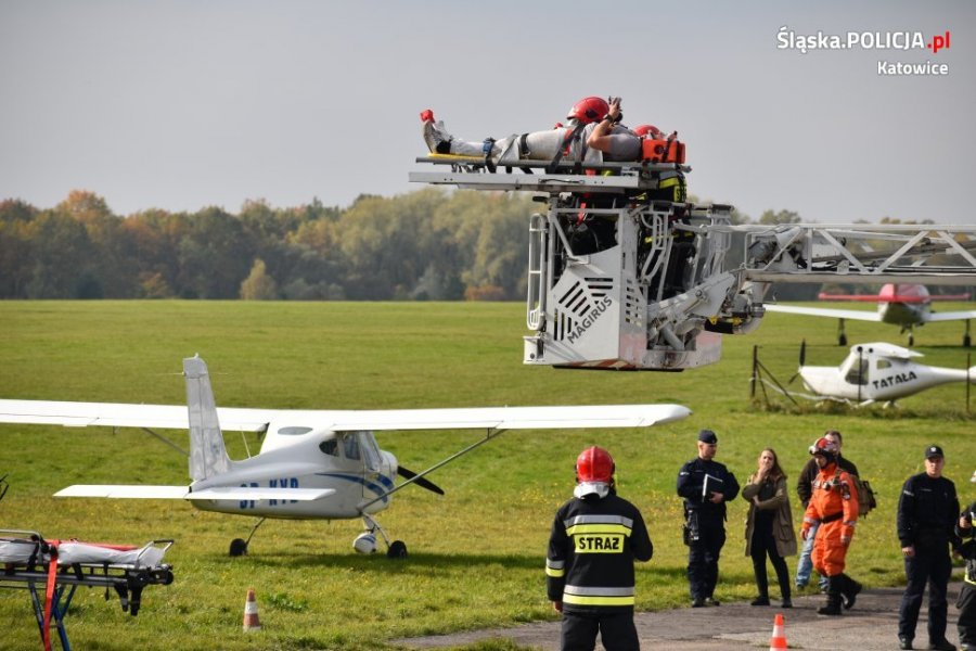 Na lotnisko Katowice – Muchowiec z dużą prędkością wjechał samochód osobowy i uderzył w stojący na pasie startowym samolot wraz z pasażerami. W wyniku uderzenia samochód zaczął się palić, a z samolotu wydobywały się kłęby dymu. Osoby znajdujące się w samolocie zostały ranne. Kierujący samochodem w wyniku szoku uciekł z miejsca zdarzenia i zabarykadował się w jednym z hangarów. W czasie zdarzenia na lotnisku odbywał się kurs spadochronowy Aeroklubu Śląskiego. Nad lotniskiem krążył samolot ze skoczkami. Czterech z nich wyskoczyło już z samolotu, ale widząc zamieszanie na płycie lotniska, usiłowali wylądować jak najdalej od miejsca zdarzenia. Niestety jeden ze skoczków wylądował na dachu hangaru, a drugiego zniosło w stronę pobliskiego lasu. Taki scenariusz obowiązywał podczas ćwiczeń dowódczo – sztabowych „Lotnisko 2019”, które miały na celu doskonalenie umiejętności i współdziałania służb w chwili wystąpienia sytuacji kryzysowej. W trakcie ćwiczeń sprawdzane były procedury, aby w przypadku wystąpienia realnego zagrożenia, współpraca pomiędzy służbami przebiegała bez jakichkolwiek zakłóceń.