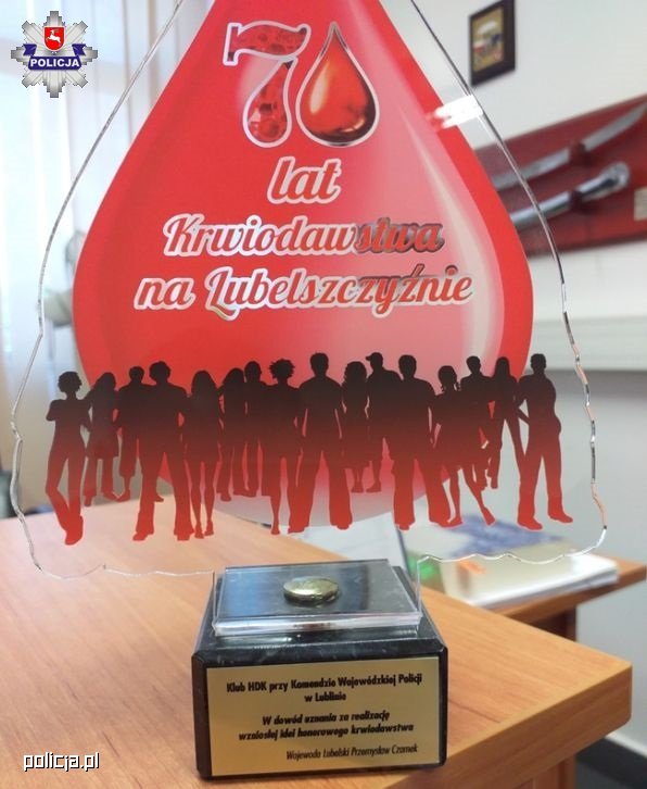 Z kolei okolicznościwoa statuetka 70-lecia krwiodawstwa na Lubelszczyźnie trafiła wczoraj do Klubu Honorowych Dawców Krwi przy KWP w Lublinie. Wyróżnienie to odebrał jeden z członków Klubu - Zastępca Naczelnika Wydziału Konwojowego KWP w Lublinie nadkom. Marcin Turos.