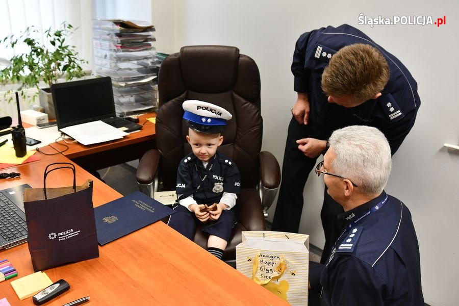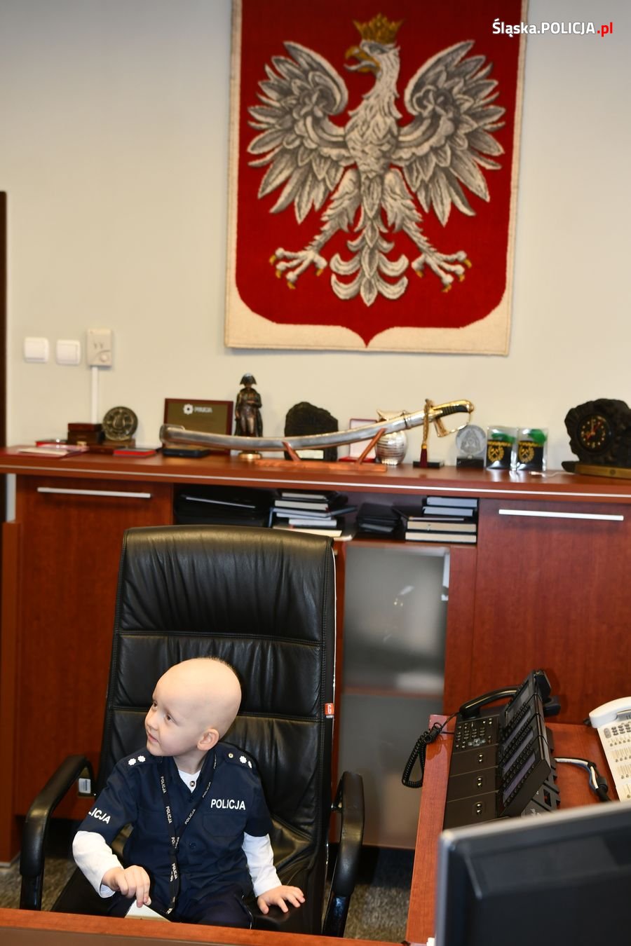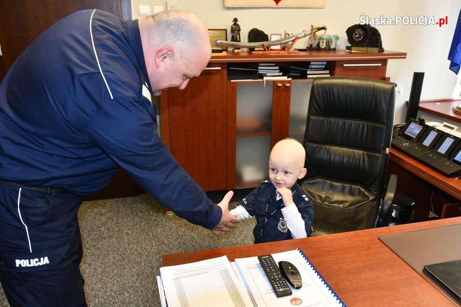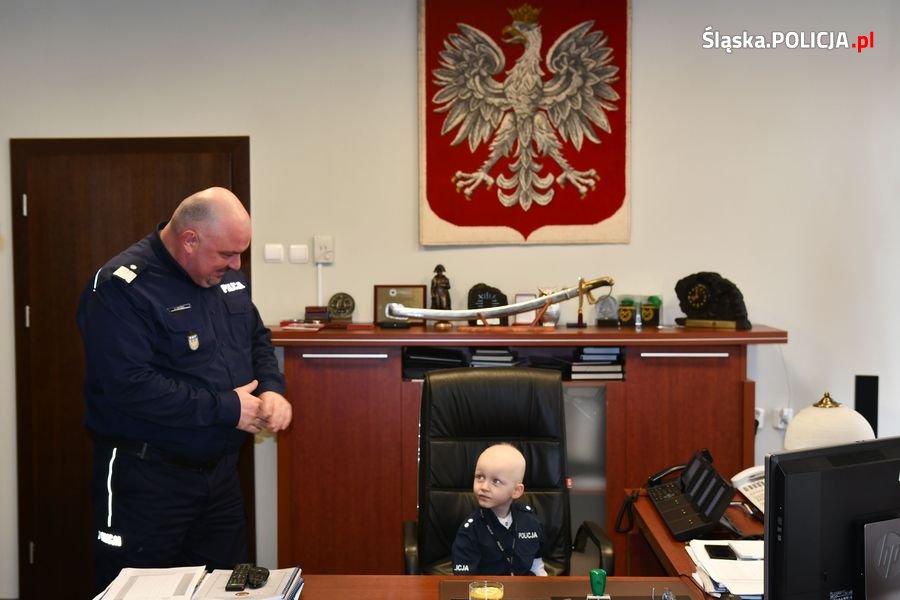 Komendant Wojewódzki Policji w Katowicach nadinsp. dr Krzysztof Justyński serdecznie przywitał młodego mundurowego i zaproponował mu zajęcie miejsca za biurkiem, skąd kieruje całym garnizonem. Następnie po wręczeniu mu szeregu upominków, Kubuś otrzymał z rąk Generała odznakę policyjną, uprawniającą go do skorzystania z wielu przygotowanych dla niego atrakcji.
