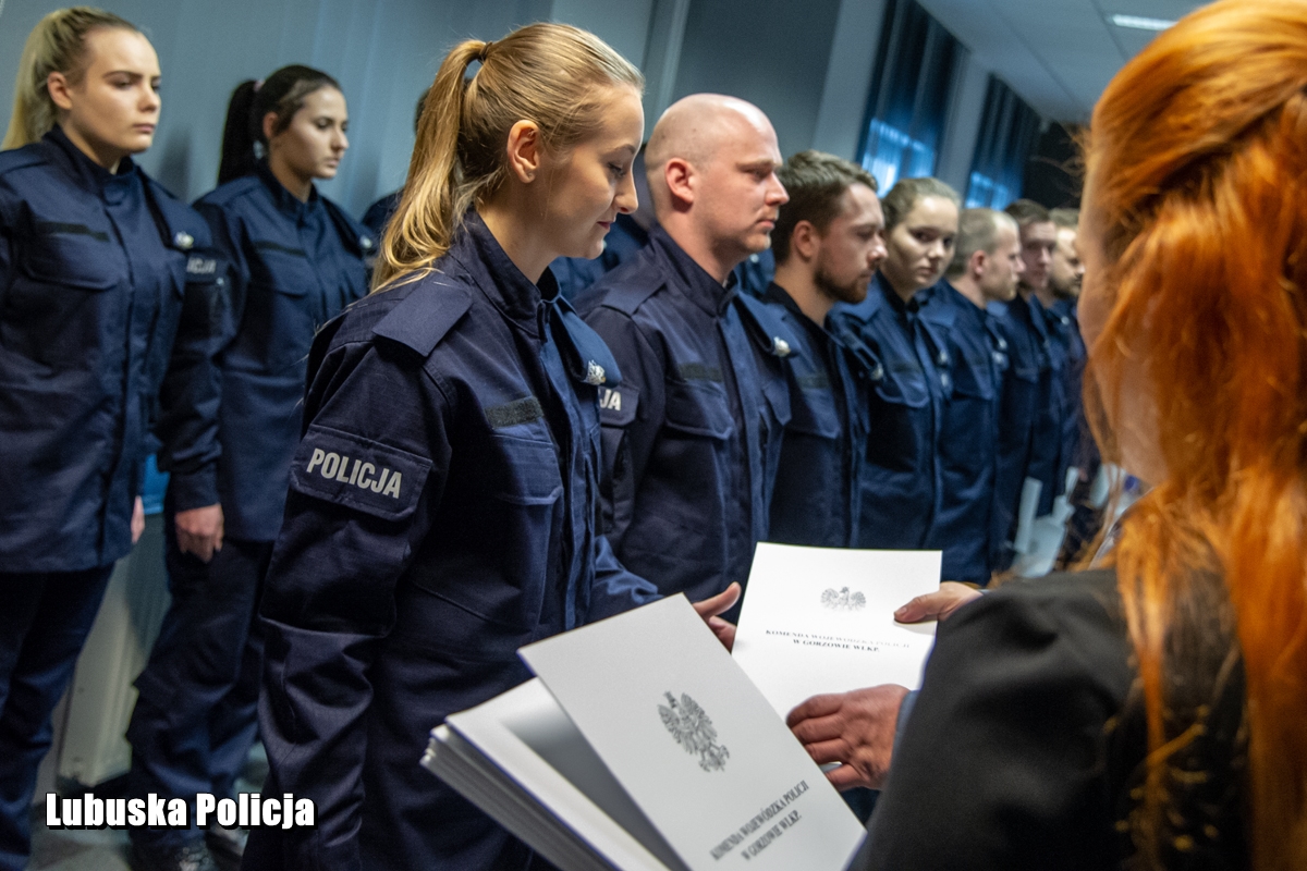 Kolejna grupa policjantów złożyła w Komendzie Wojewódzkiej Policji w Gorzowie Wielkopolskim ślubowanie, wypowiadając słowa przesięgi. Nowi funkcjonariusze zasilili szeregi jednostek w Gorzowie, Zielonej Górze, Nowej Soli, Strzelcach Krajeńskich, Sulęcinie, Świebodzinie, Wschowie, Żarach, Żaganiu oraz Oddziałów Prewencji. Policjantom towarzyszyli najbliżsi. Dla wielu z nich wydarzenie to było zwieńczeniem wielomiesięcznych starań i spełnieniem zawodowych marzeń. Uroczystość zgromadziła kadrę kierowniczą Lubuskiej Policji. Wzięli w niej udział również przedstawiciele Lubuskiego Urzędu Wojewódzkiego – Zastępca Dyrektora Wydziału Bezpieczeństwa i Zarządzania Kryzysowego Artur Wójtowicz. Słowa powitania do nowo przyjętych funkcjonariuszy skierował I Zastępca Komendanta Wojewódzkiego Policji w Gorzowie Wlkp. młodszy inspektor Bogdan Piotrowski: „...z wielką radością przyjmujemy Was w nasze szeregi i z wielką radością przyjmuje Was społeczność Ziemi Lubuskiej. Życzę Wam, abyście – czerpiąc z doświadczeń oraz zawodowych dokonań starszych kolegów – odnosili wiele sukcesów. Nie bójcie się wyzwań, zawsze kierujcie się dobrem drugiego człowieka, empatią i wyrozumiałością. Przyjmijcie również życzenia wytrwałości, a w niedalekiej przyszłości zasłużonych awansów. Powodzenia!” Młodzi policjanci 21 listopada rozpoczną szkolenie podstawowe, które przygotuje ich do pełnienia służby policyjnej. W Szkole Policji w Pile spędzą najbliższe sześć miesięcy. Po powrocie i adaptacji będą pełnić służbę w swoich jednostkach macierzystych.