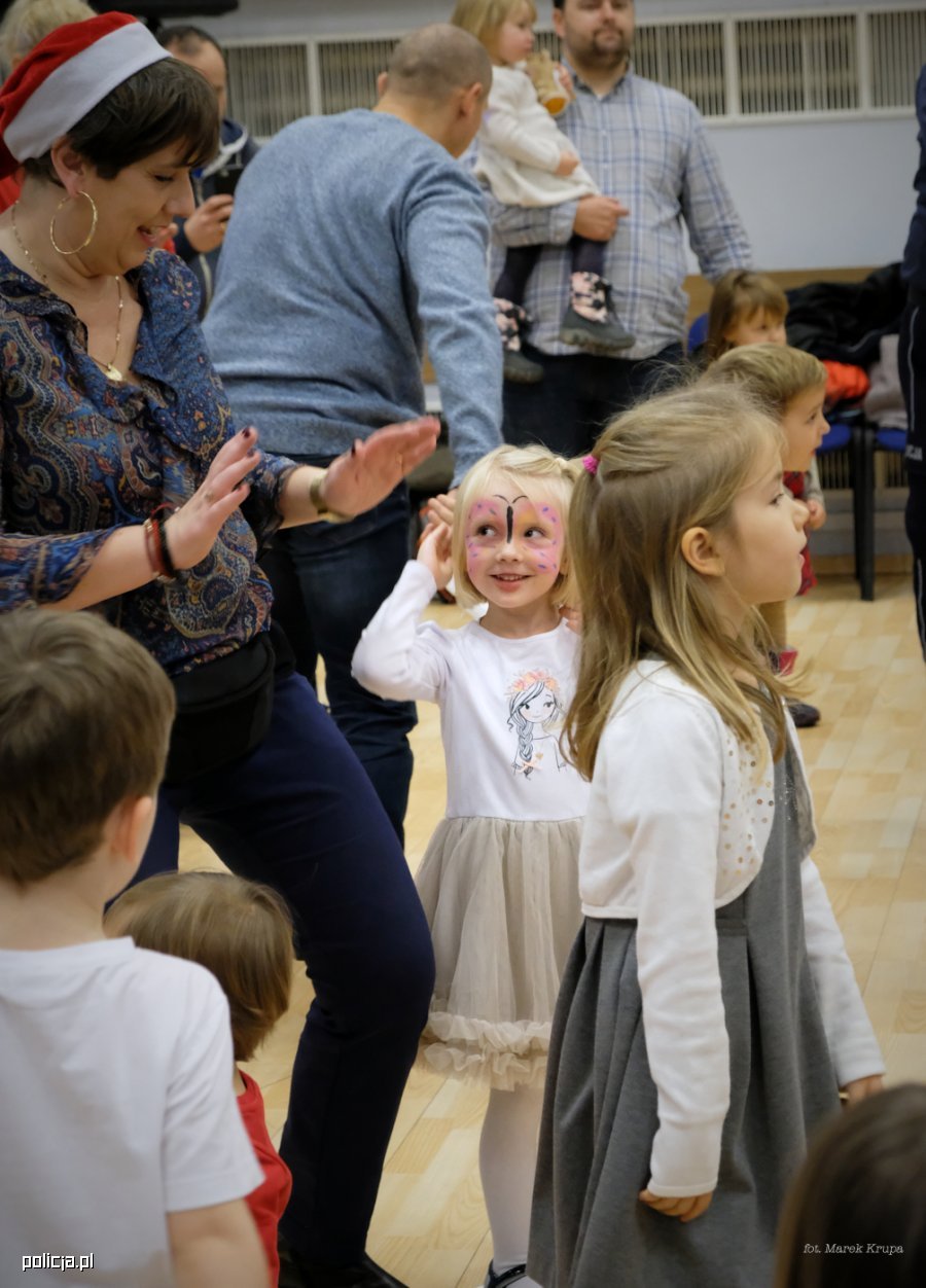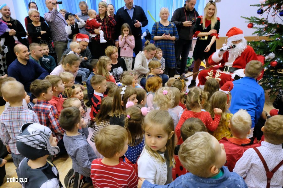 Była choinka i wspólne śpiewanie kolęd i to, co najważniejsze: upominki. Dzieci z wypiekami na twarzy wyczekiwały Świętego. Zapewne był to najważniejszy punkt sobotniej zabawy. Worek z prezentami był tak ogromny, że niebieskie policyjne elfy musiały mu pomóc w dźwiganiu. Oprócz prezentów pamiątką na zawsze pozostaną wspólne fotografie.