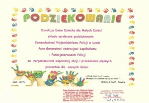 I Zastępca Komendanta Wojewódzkiego Policji w Łodzi insp. Tomasz Olczyk, insp. Paweł Karolak Komendant Miejski w Łodzi a także przewodniczący NSZZ Policjantów Województwa Łódzkiego nadkom. Krzysztof Balcer pojawili się w Domu Małego Dziecka w Łodzi przy ulicy Drużynowej. Przekazali paczki wypełnione po brzegi zabawkami, kosmetykami pielęgnacyjnymi, artykułami spożywczymi i odzieżą. Świąteczną akcję na rzecz podopiecznych placówki zorganizowali funkcjonariusze i pracownicy Komendy Wojewódzkiej Policji w Łodzi. Do przedsięwzięcia przyłączyły się również jednostki Policji z garnizonu łódzkiego.