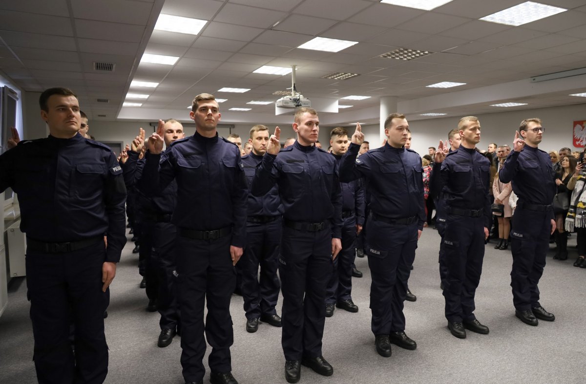 Nowi policjanci wypowiedzieli słowa, które stanowią bardzo ważne zobowiązanie: "Ja, obywatel Rzeczypospolitej Polskiej, świadom podejmowanych obowiązków policjanta, ślubuję: służyć wiernie Narodowi, chronić ustanowiony Konstytucją Rzeczypospolitej Polskiej porządek prawny, strzec bezpieczeństwa Państwa i jego obywateli, nawet z narażeniem życia. Wykonując powierzone mi zadania, ślubuję pilnie przestrzegać prawa, dochować wierności konstytucyjnym organom Rzeczypospolitej Polskiej, przestrzegać dyscypliny służbowej oraz wykonywać rozkazy i polecenia przełożonych. Ślubuję strzec tajemnic związanych ze służbą, honoru, godności i dobrego imienia służby oraz przestrzegać zasad etyki zawodowej."