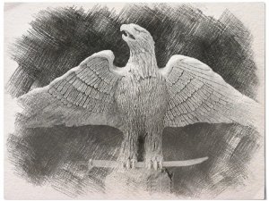 Na wprost bramy wejściowej do kwatery znajdował się (przetrwał do czasów współczesnych) obelisk – stożkowy cokół o wysokości 2,5 metra wystawiony z obrobionych kamieni polnych, na którym widniała marmurowa tablica inskrypcyjna z napisem:
