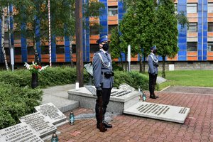 Dzisiaj przed Grobem Policjanta Polskiego - Miejscem Pamięci Narodowej znajdującym się na terenie Komendy Wojewódzkiej Policji w Katowicach upamiętniono 98. rocznicę powrotu części Górnego Śląska do Polski i utworzenia Policji Województwa Śląskiego. Komendant Wojewódzki Policji w Katowicach nadinsp. dr Krzysztof Justyński oraz delegacja Zarządu Ogólnopolskiego Stowarzyszenia Rodzina Policyjna 1939 r., na czele z Prezes Teresą Bracką i Przewodniczącym Bielskiego Oddziału Stowarzyszenia mł. insp. Michałem Pudło, przy zachowaniu warunków bezpieczeństwa w związku z zagrożeniem COVID-19, złożyli kwiaty i oddali hołd poległym policjantom Policji Województwa Śląskiego, służącym w okresie II RP oraz zamordowanych przez okupantów z okresu II wojny światowej.