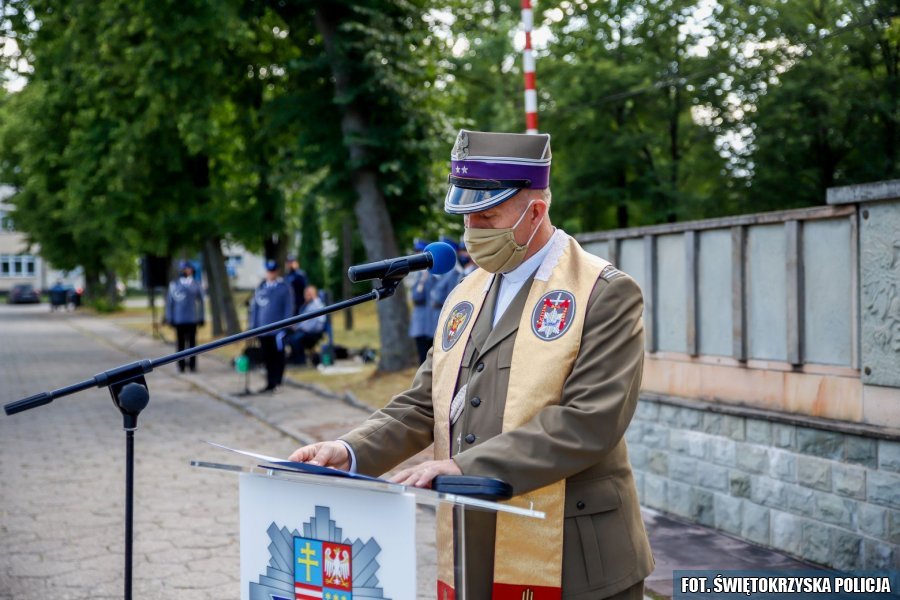 W uroczystości wziął udział m.in. Wojewoda Świętokrzyski Zbigniew Koniusz, p.o. Pierwszy Zastępca Komendanta Wojewódzkiego insp. Jarosław Tokarczyk, Zastępcy Komendanta Wojewódzkiego Policji w Kielcach podinsp. Andrzej Patrzałek oraz mł. insp. dr Agata Malasińska – Nagórny, kadra kierownicza świętokrzyskiej Policji oraz Kapelan Wojewódzkiego Ośrodka Duszpasterskiego w Kielcach ks. ppłk. Grzegorz Kamiński. Podczas przemówienia nadinsp. Paweł Dzierżak złożył nowym funkcjonariuszom gratulacje i życzył sukcesów w przyszłej służbie. Do nowych mundurowych zwrócił się także Wojewoda Świętokrzyski, który również gratulował adeptom oraz podkreślił jak ważną rolę w naszym społeczeństwie odgrywają policjanci.