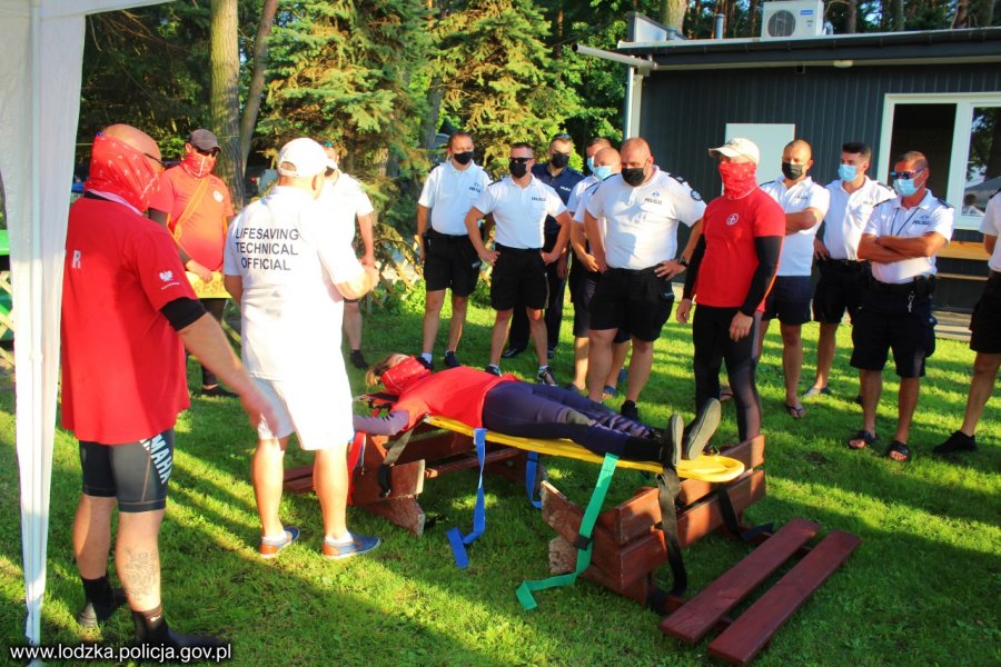 Następnie funkcjonariusze realizowali ćwiczenie dot. ratowania osoby tonącej z brzegu z elementami skoku lub wbiegnięcia do wody, dopłynięcia do tonącego, nurkowania gdy tonący znajdował się pod wodą, opanowania tonącego oraz holowania tonącego i wyciągania go na łódź motorową. Wykorzystano zarówno podręczny sprzęt ratowniczy jak i koło ratunkowe, pas ratowniczy , bojkę czy deskę ortopedyczną. "Przerobiono" również zespołową akcję przy użyciu liny asekuracyjnej z szelkami.