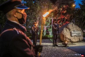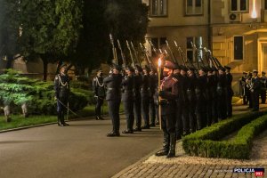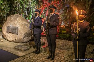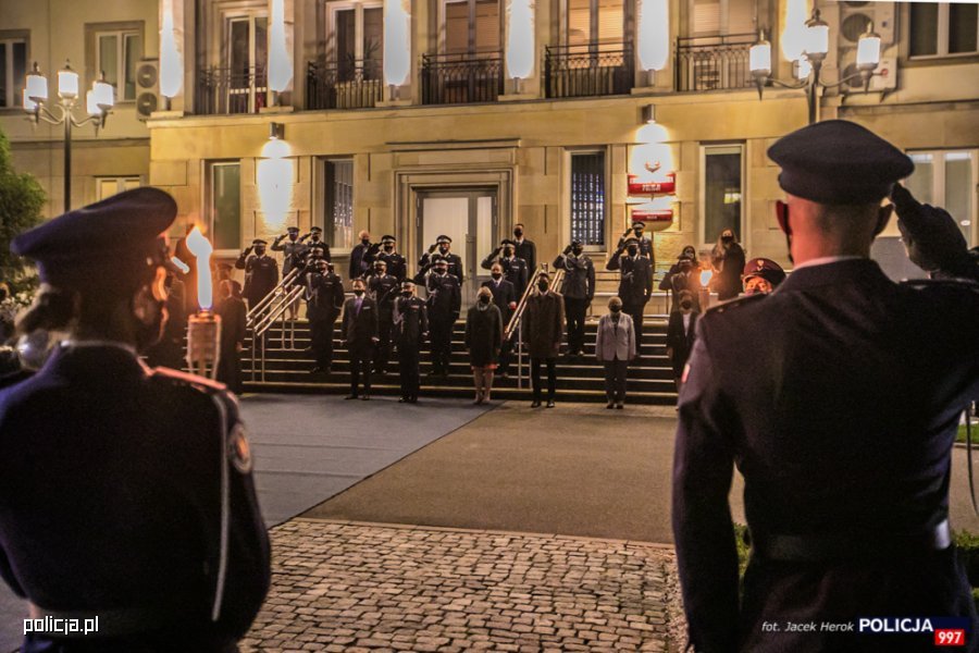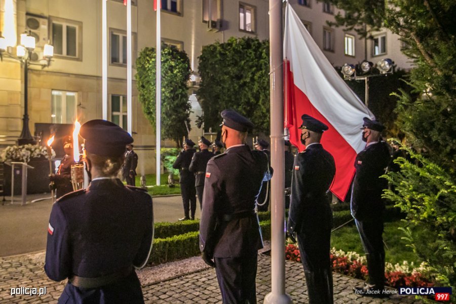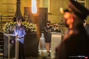 Komendant Główny Policji gen. insp. Jarosław Szymczyk w swoim przemówieniu powiedział, że w 2000 roku w 60 rocznicę zbrodni katyńskiej w Miednoje otwarty został polski cmentarz wojenny. "To właśnie to miejsce, jakże ważne dla wszystkich policjantów Muzeum Katyńskie, Grób Polskiego Policjanta na terenie Komendy Wojewódzkiej Policji w Katowicach i to miejsce przed frontem budynku KGP Obelisk „Poległym Policjantom - Rzeczpospolita Polska“ są źrodłem naszej narodowej i służbowej tożsamości. W tym roku niestety nie mogliśmy odwiedzić, znajdujących się tam, w Miednoje grobów pomordowanych policjantów, żołnierzy, funkcjonariuszy i urzędników i oddać cześć ich pamięci". Dodał też, że jest głęboko przekonany, że spotykając się przed Obeliskiem „Poległym Policjantom - Rzeczpospolita Polska“ jesteśmy w stanie godnie uczcić pamięć tych wszystkich funkcjonariuszy II Rzeczpospolitej, którzy dla swojej ukochanej ojczyzny słowa roty ślubowania wypełnili do końca i spoczęli z dala od swoich bliskich na nieludzkiej ziemi, w dołach śmierci. Gen. insp. Jarosław Szymczyk podziękował wszystkim przybyłym na tę uroczystość. "Stojąc dzisiaj przed Obeliskiem „Poległym Policjantom - Rzeczpospolita Polska“ dajemy świadectwo naszej pamięci o polskich policjantach, którzy w jednej chwili zostali brutalnie pozbawieni marzeń, nadziei, bliskości ukochanych osób i stali się ofiarami sowieckiej kaźni". Komendant szczególne słowa uznania skierował do potomków zbrodni katyńskich. "Tylko oni bowiem wiedzą, ile łez, cierpienia i upokorzeń kosztowało dojście do prawdy o losie ich bliskich, do prawdy, która od samego początku przez 50 lat tak skrzętnie była ukrywana".