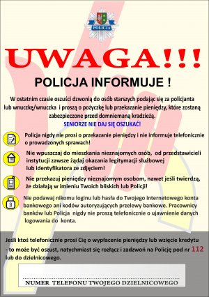 NIE DAJ SIĘ NABRAĆ – Policja NIGDY nie żąda przekazania pieniędzy, nie proponuje zabezpieczenia oszczędności oraz nie angażuje obywateli w prowadzone sprawy.