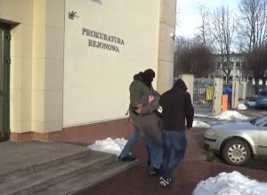 Na filmie widać policjantów prowadzących zatrzymanego do budynku komendy.