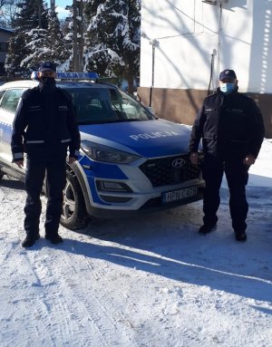 Mundurowi natychmiast pojechali na miejsce, które określono w zgłoszeniu. Było już ciemno, ale na szczęście na śniegu widoczne były ślady butów, odciski łap zwierzęcia oraz ślady ciągniętych toreb. Policjanci, oświetlając sobie drogę latarkami, poszli przez zaśnieżone pole. Nawoływali cały czas, lecz nikt nie odpowiadał, nie wzywał pomocy. Po kilkuset metrach zauważyli psa, który samotnie błąkał się po polu. W pewnym momencie spostrzegli skuloną sylwetkę człowieka w pobliżu kępy drzew. Okazało się, że jest to 88-letnia kobieta, która straciła orientację w terenie i idąc przez zaśnieżone pole, opadła z sił. Kobieta była w oddali od zabudowań i nie wiedziała, gdzie się znajduje. Groziło jej realne niebezpieczeństwo utraty życia z powodu wychłodzenia. Policjanci natychmiast przetransportowali kobietę do radiowozu i odwieźli razem z psem do miejsca zamieszkania, gdzie zaopiekowali się nią najbliżsi.