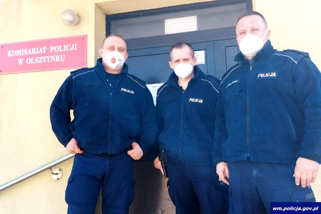 Policjanci z Komisariatu Policji w Olsztynku ratowali mieszkańców płonącego domu. Jeden był w czasie wolnym od służby i gdy zauważył zagrożenie, powiadomił służby. Na miejsce pierwsi dotarli jego koledzy z komisariatu. Wspólnie błyskawicznie zarządzili ewakuację lokatorów płonącego budynku, odłączyli prąd oraz zablokowali dopływ powietrza do pomieszczeń zagrożonych ogniem. Dzięki szybkiej i zdecydowanej reakcji policjantów, nikomu z mieszkańców płonącego budynku nic się nie stało.