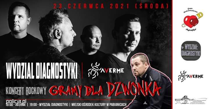 Funkcjonariusze zachęcają także do wzięcia udziału w koncercie rockowym „Gramy dla DZWONKA”. Wydarzenie to odbędzie się 23 czerwca 2021 roku w Miejskim Ośrodku Kultury im. Zbigniewa Herberta w Pabianicach. Wystąpią dwa zespoły: AVERME oraz WYDZIAŁ DIAGNOSTYKI, w którym gra pabianicki policjant. Warunkiem uczestnictwa w wydarzeniu jest pokazanie przy wejściu potwierdzenia wpłaty na leczenie chorego policjanta. Kwota powinna być wpłacona w dniu koncertu na zbiórkę: Pomoc Dla Rafala part II "Dobro Wraca" ►