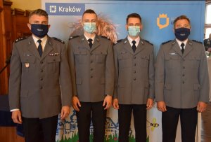 nagrodzeni policjanci w towarzystwie komendanta Komisariatu Policji V o raz Komendy Miejskiej Policji w Krakowie -