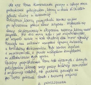 Do Komendanta Powiatowego Policji w Inowrocławiu podinsp. Karola Konopackiego wpłynął list z Radomia. Nadawcą jest kobieta, która przebywała w Inowrocławiu w sanatorium, a padła niestety ofiarą przestępstwa. W liście skierowanym na ręce Szefa inowrocławskiej policji podziękowała za szybkie działanie stróżów prawa, wsparcie i nieocenioną pomoc.