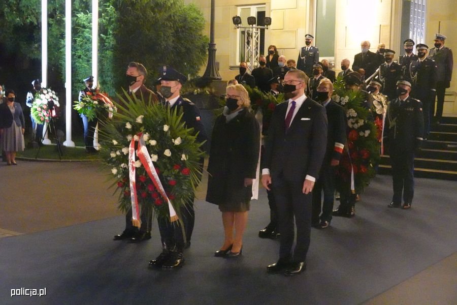 Tuż przed godz. 20.00 pod Tablicą Pamięci w gmachu Komendy Głównej Policji, gdzie umieszczone są inskrypcje epitafijne z nazwiskami policjantów, którzy oddali życie w związku ze służbą, ratując innych bądź stając w ich obronie, odbyła się uroczysta zbiórka. Szef Gabinetu Politycznego MSWiA Michał Prószyński w imieniu Ministra Spraw Wewnętrznych i Administracji Mariusza Kamińskiego oraz Komendant Główny Policji gen, insp. Jarosław Szymczyk, I Zastępca Komendanta Głównego Policji nadinsp. Dariusz Augustyniak oraz Zastępcy nadinsp. Paweł Dobrodziej oraz nadinsp. Roman Kuster złożyli wieńce.