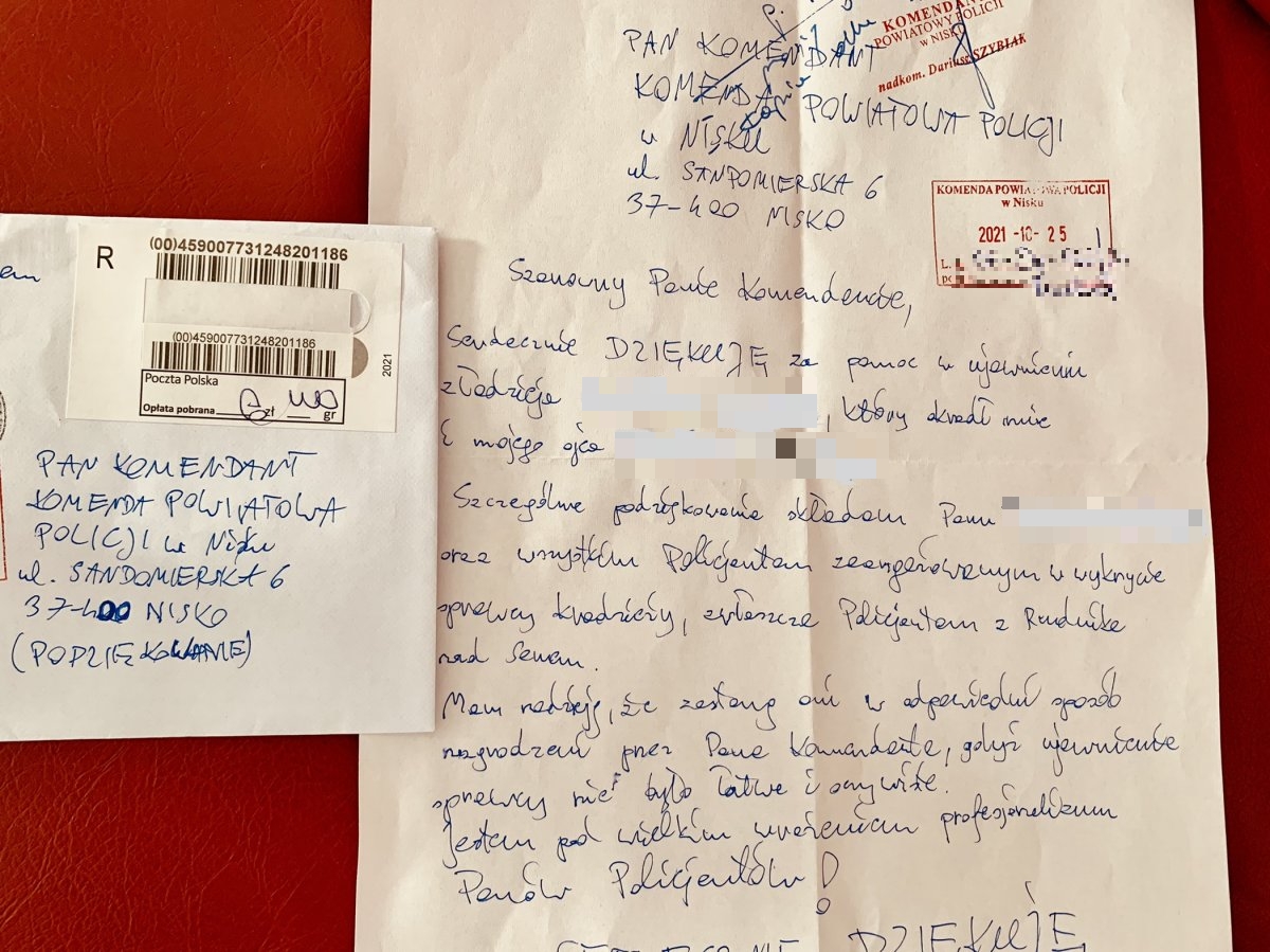 Mężczyzna podziękował funkcjonariuszom za empatię i zaangażowanie, jakim wykazali się wobec niego oraz jego najbliższych, gdy zostali okradzeni. Mieszkaniec gminy Rudnik nad Sanem opisuje w liście do Komendanta Powiatowego Policji w Nisku nadkom. Dariusza Szybiaka, że niżańscy kryminalni oraz policjanci z Komisariatu Policji w Rudniku nad Sanem wykazali się dużym profesjonalizmem podczas prowadzonych czynności, które doprowadziły do ustalenia sprawcy kradzieży. W wyniku podjętych działań pokrzywdzony otrzymał od sprawcy równowartość pieniężną za skradzione mienie.