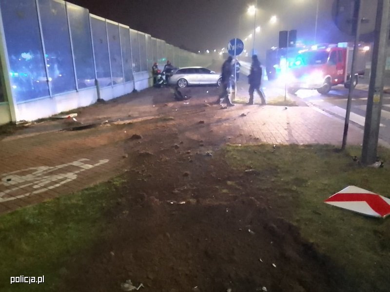 Nietrzeźwy kierowca zdemolował samochodem rondo