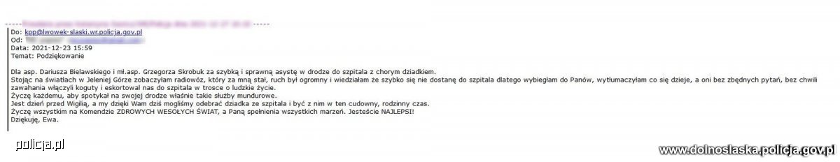 17 grudnia br. dzielnicowi z Komendy Powiatowej Policji w Lwówku Śląskim w ramach czynności służbowych byli w Jeleniej Górze, kiedy to na jednym ze skrzyżowań podbiegła do nich zdenerwowana kobieta prosząc o pomoc w szybkim dotarciu do szpitala z chorym dziadkiem. Policjanci mając świadomość jak duży ruch jest na drodze w okresie przedświątecznym oraz fakt, że ludzkie życie może być zagrożone, bez chwili zawahania włączyli sygnały świetlne i dźwiękowe i eskortowali pojazd do pobliskiego szpitala.