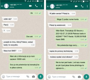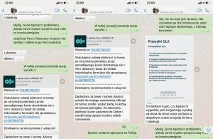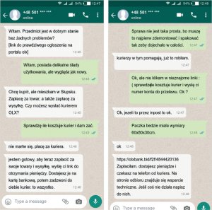1. Przestępcy kontaktują się w sprawie zakupu przedmiotów wystawionych na sprzedaż, wykorzystując komunikator WhatsApp.