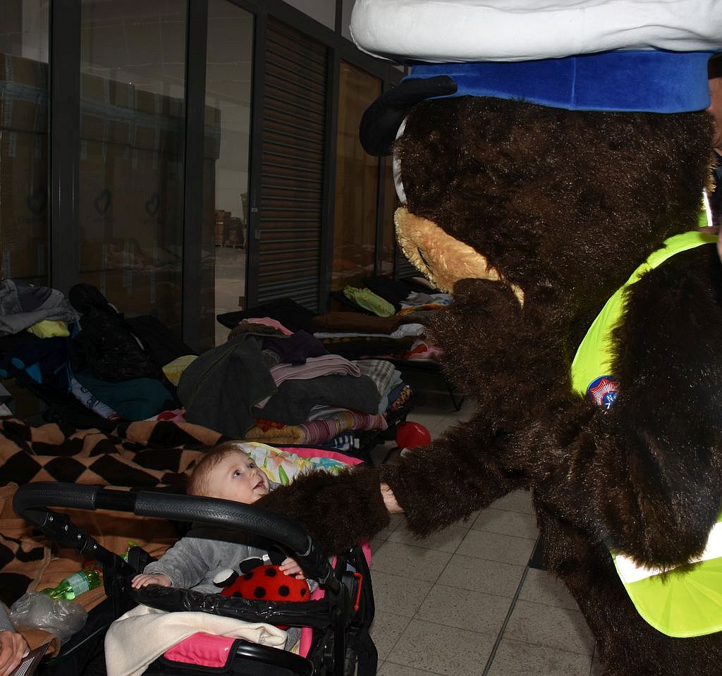 Taki zwykły, szczery dziecięcy uśmiech, u dzieci przebywających w Hali Kijowskiej, wywołali funkcjonariusze z Komendy Wojewódzkiej Policji w Rzeszowie i jarosławskie policjantki. W obecności policyjnego misia, funkcjonariuszki rozdawały słodkości oraz zabawki, chcąc dodać im chociaż na chwilę radości, w tym trudnym dla nich czasie. W trakcie tego spotkania, policjant przekazywał mamom dzieci ulotki dotyczące problematyki handlu ludźmi i zaginięć osób.