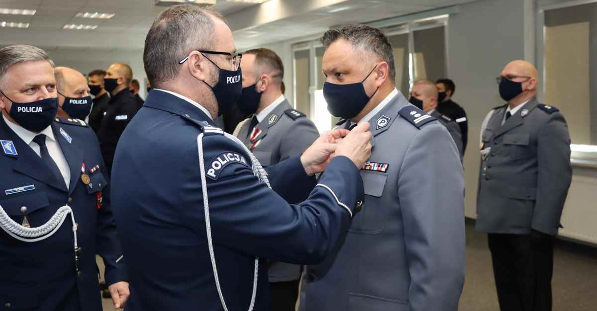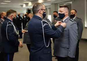 Po uroczystym ślubowaniu insp. Waldemar Wołowiec w towarzystwie swoich zastępców mł. insp. Piotra Janika, insp. Dariusza Krzesickiego wręczyli odznaczenia resortowe.