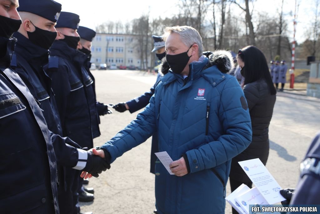 Dziś rotę ślubowania wypowiedziało 23 nowych funkcjonariuszy. Mundurowych w szeregach formacji powitała kadra kierownicza świętokrzyskiej Policji z Komendantem Wojewódzkim Policji w Kielcach dr nadinsp. Jarosławem Kaletą na czele. W ceremonii ślubowania oraz wręczenia legitymacji służbowych na placu apelowym przy ulicy Kusocińskiego uczestniczył Wojewoda Świętokrzyski Pan Zbigniew Koniusz.