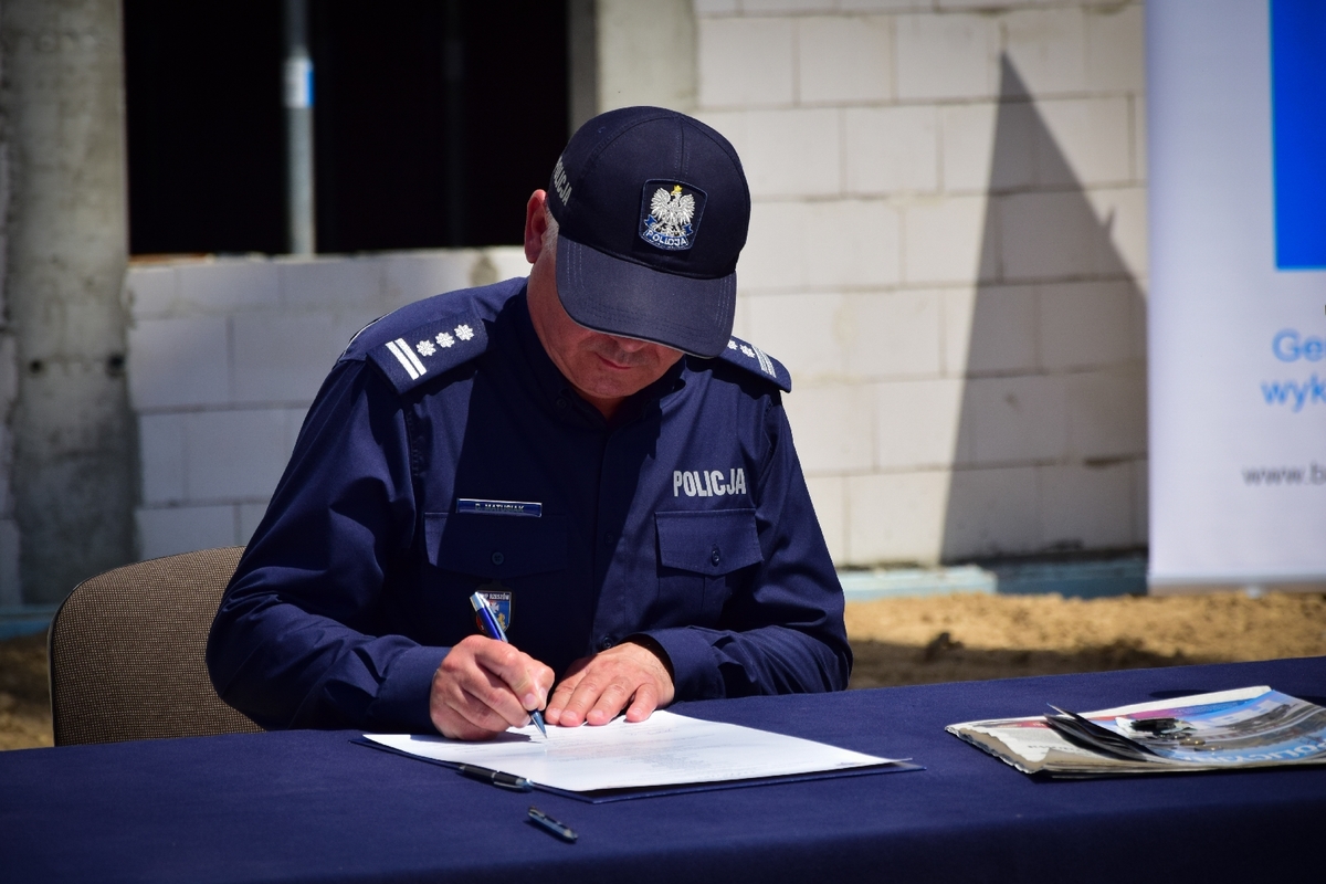 Dziś, na placu budowy w Rzeszowie przy ul. Błogosławionej Karoliny odbyło się uroczyste podpisanie aktu erekcyjnego. Swoje podpisy na dokumencie złożyli m.in. insp. Andrzej Kropiwiec Dyrektor Biura Logistyki Komendy Głównej Policji, insp. Dariusz Matusiak Komendant Wojewódzki Policji w Rzeszowie, insp. Bogusław Kania Komendant Miejski Policji w Rzeszowie, Jolanta Sawicka I Wicewojewoda Podkarpacki, Stanisław Kruczek Członek Zarządu Województwa Podkarpackiego, Konrad Fijołek Prezydent Miasta Rzeszowa oraz Lucyna Sokołowska Członek Zarządu Powiatu Rzeszowskiego. Byli też przedstawiciele wykonawcy, projektanta oraz kierownictwa budowy.
