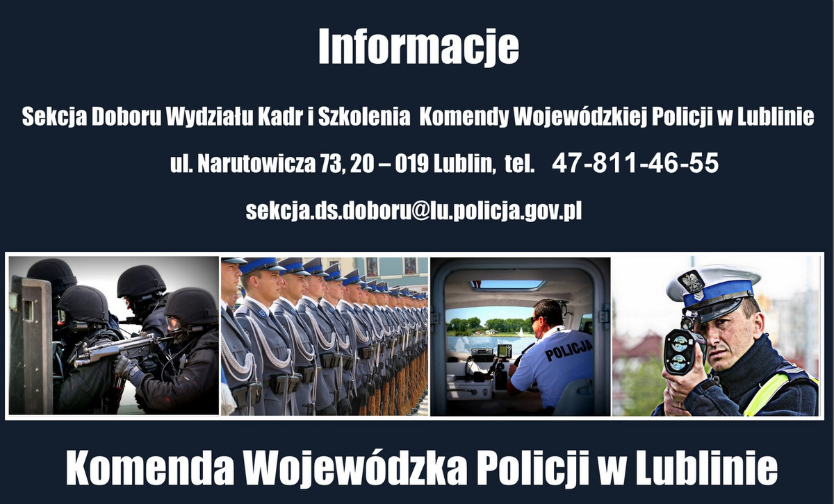 Informacje o przebiegu procedury rekrutacyjnej, warunkach, jakie trzeba spełnić, by zostać policjantem oraz wymaganych dokumentach rozpoczynających dobór, można uzyskać w Sekcji Doboru Wydziału Kadr i Szkolenia Komendy Wojewódzkiej Policji w Lublinie przy ulicy Narutowicza 73, pod numerem 47 811-46-55.