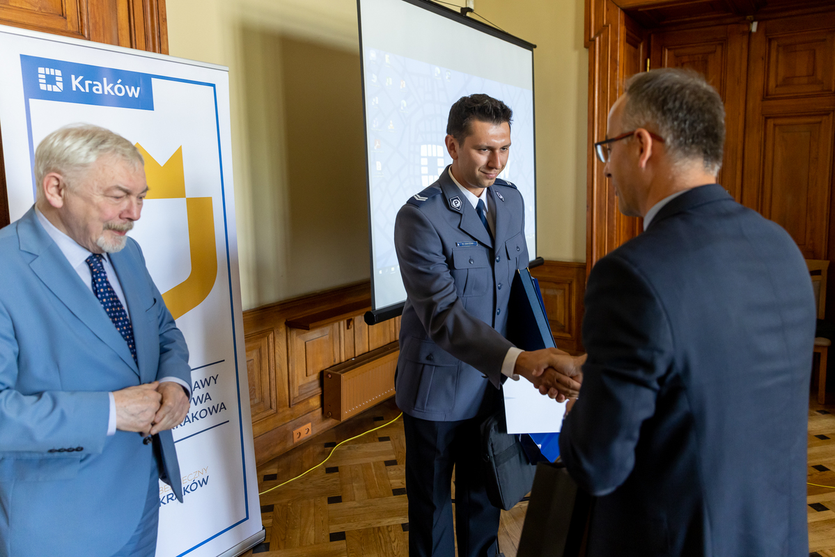 Krakowscy policjanci odebrali z rąk prezydenta miasta Krakowa nagrody w ramach programu „ Bezpieczny Kraków”