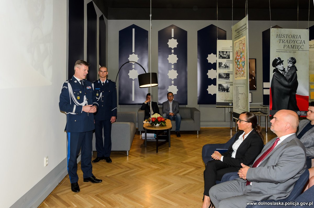 Po części oficjalnej przyszedł czas na rozmowy o poświęceniu dla służby i ojczyzny, o tym jak pamięć o przodkach może przetrwać dzięki ich potomkom, ale też była to niezwykła okazja, aby poznać bliżej Komendę Wojewódzką Policji we Wrocławiu. Naczelnik Wydziału Prezydialnego kom. Arkadiusz Majcherek oprowadził rodzinę patrona po gmachu naszej jednostki, który jest również częścią historii dolnośląskich funkcjonariuszy.