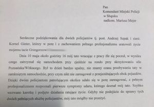 Na ręce Komendanta Miejskiego Policji w Słupsku wpłynęło podziękowanie od Pani Dominiki dla policjantów ze słupskiej drogówki sierż. Kornela Gintera i st. post. Andrzeja Szpaka. Dzięki ich szybkiej reakcji i zachowaniu pełnego profesjonalizmu udało się uratować życie jej taty, który w trakcie jazdy samochodem zasłabł przed skrzyżowaniem i wymagał pilnej interwencji lekarza.